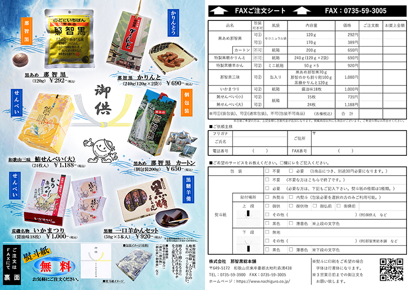(例)上段:御供 下段:那智黒総本舗 色:上下とも薄墨色 など